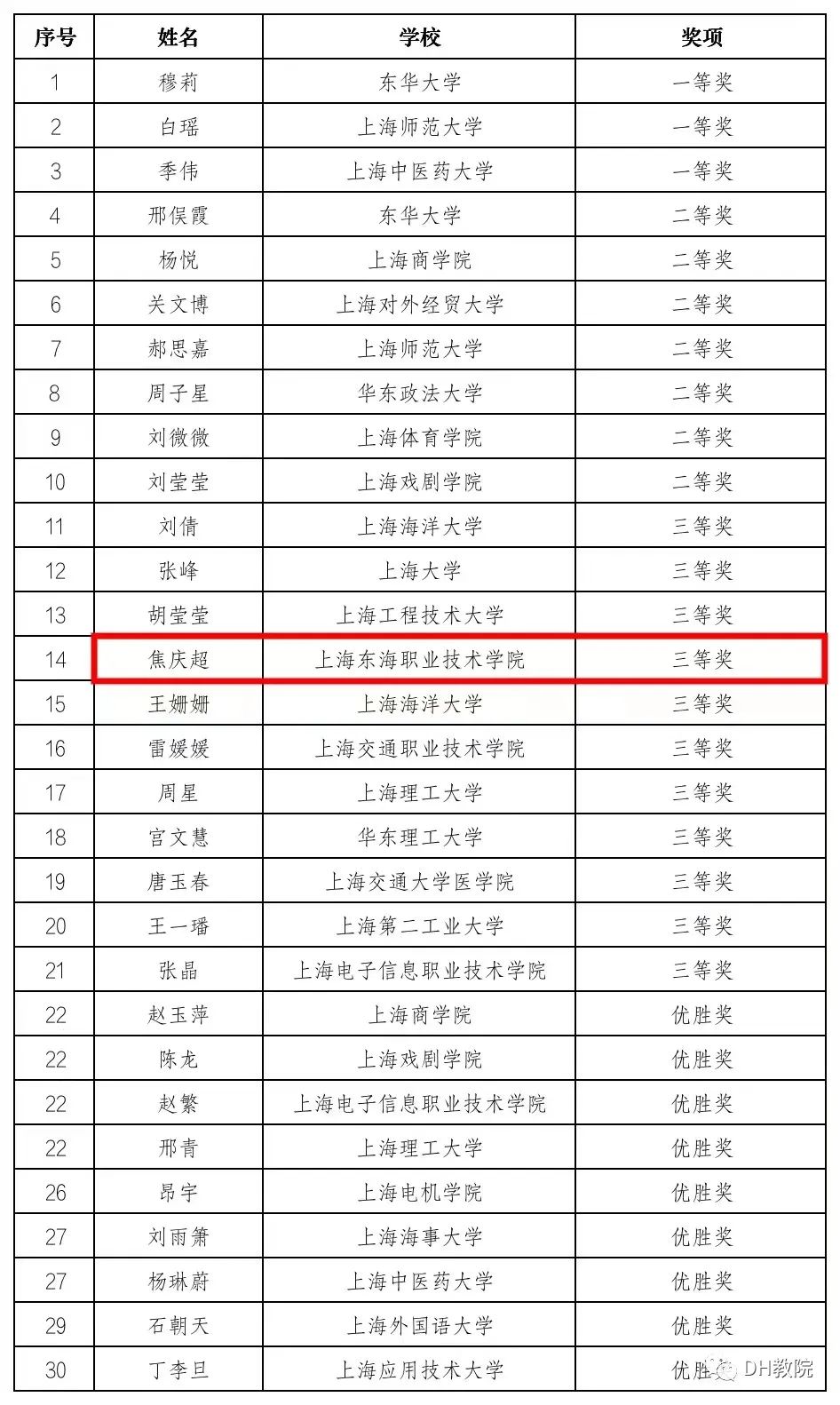 本届大赛由中共上海市教育卫生工作委员会、上海市教育委员会主办,东华大学和上海市学生德育发展中心承办,吸引沪上高校共计80余名辅导员参赛。经过案例分析和理论宣讲环节展示,评选出一等奖3名、二等奖7名、三等奖11名、优胜奖9名,上海东海职业技术学院教育学院辅导员焦庆超老师荣获三等奖。具体获奖名单如下: