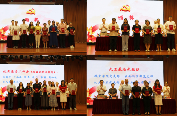 在雄壮的国歌声中,大会拉开序幕。董事长、党委委员曹助我宣读“两优一先”表彰决定。授予万黎黎等19名同志学校“优秀共产党员”称号,授予朱新华等8名同志学校“优秀党务工作者”,授予航空学院党支部等4个党支部学校“先进基层党组织”称号。