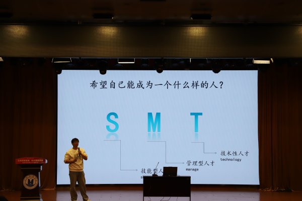 活动中,陈斌校友从“你想成为什么样的人才”问题出发,给大家分享自就业以来的心路历程,从就业现状、技能证书、身边的大国工匠等方面,为大家做了一场生动的主题报告。他告诉学弟学妹们,要充分激活自信与潜能,找到自己成长的“破发点”,努力成为对社会有贡献的高素质技术技能人才。
