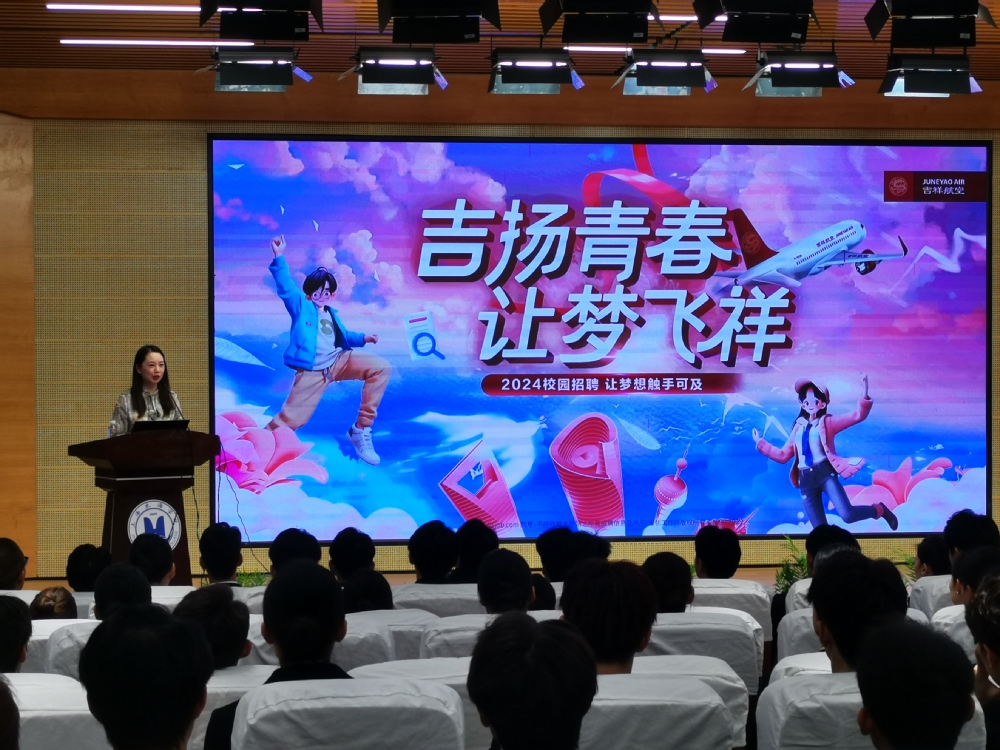 紧接着,吉祥航空人力招聘经理周晓芬从“为什么选择吉祥”、“吉祥能提供什么”和“怎样加入吉祥”三方面内容,详细介绍了吉祥航空的基本情况、服务理念和招聘要求等内容,并与学生开展互动交流。客舱乘务分部经理王雪晴则重点讲解了公司客舱部的情况,以及吉祥航空完善的人才竞升模式、HOME文化、新版制服和客舱部组织构架等,让本次参加招聘的学生对吉祥航空有了更为深入的了解。
