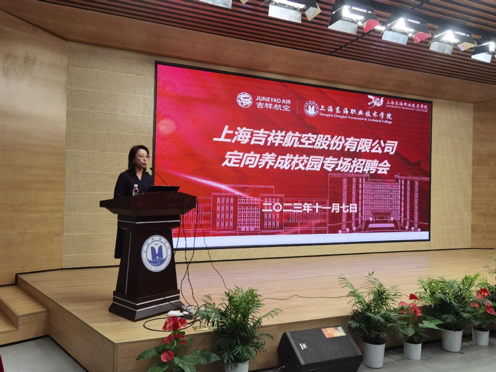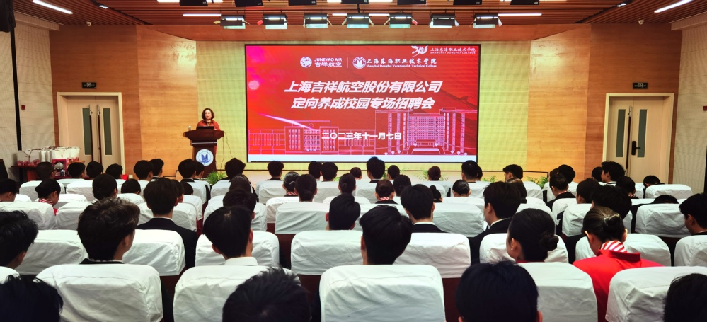 为积极响应国家加快发展现代职业教育举措,进一步深化产教融合力度,推进校企深度合作,主动对接地方产业和企业岗位需求,为社会、为企业培养“下得去、用得上、留得住”的高素质高技能应用型技能人才。2023年11月7日,上海吉祥航空股份有限公司定向养成校园专场招聘会暨校企空地联动总结表彰会在我校匠兴苑学术报告厅举行。上海吉祥航空股份有限公司人力资源部副总经理孙丽、人力招聘处经理徐奕晨、人力招聘经理周晓芬,我校副校长郁萍、航空学院院长周孟华出席,航空学院近200余师生参加此次活动。