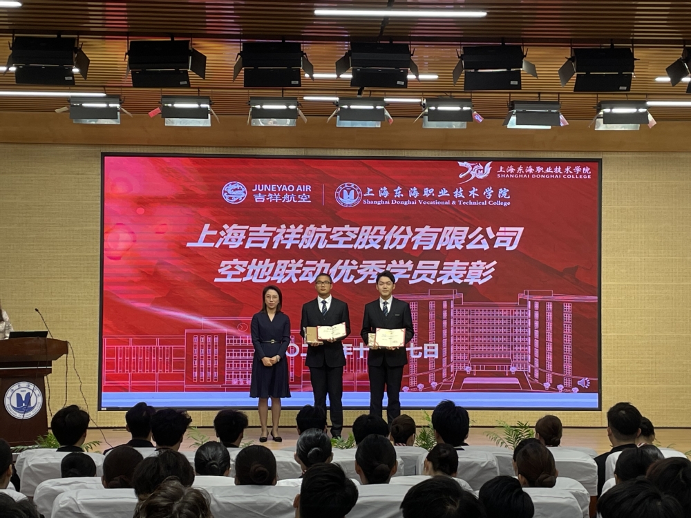 此次活动,吉祥航空对2023年空地联动14名学员进行了表彰奖励。航空学院院长周孟华首先回顾了2023年空地联动学生在岗的表现情况,吉祥空地联动合作模式能够让学生更早接触企业文化、学习专业技能、达到企业标准,学校能够更加有针对性地制定培养教学方案,企业则能保质保量地的获得真正需要的定制型人才,实现学校、企业和学生三方共赢的目标。随后,吉祥航空人力资源部副总经理孙丽、人力招聘处经理徐奕晨对顺利完成2023年空地联动14名学员颁发了证书及纪念品,并对优秀学员进行表彰奖励。这既是对获奖优秀学员的肯定,也是我校深化校企合作、助力人才培养的具体体现。2022级空中乘务专业学生范仕龙代表全体学员发言,他为能够加入吉祥航空而倍感激动,并承诺必将珍惜这次选拔机会,更加严格要求自己,不辜负学校对他们的期待,为成为准吉祥人而努力。