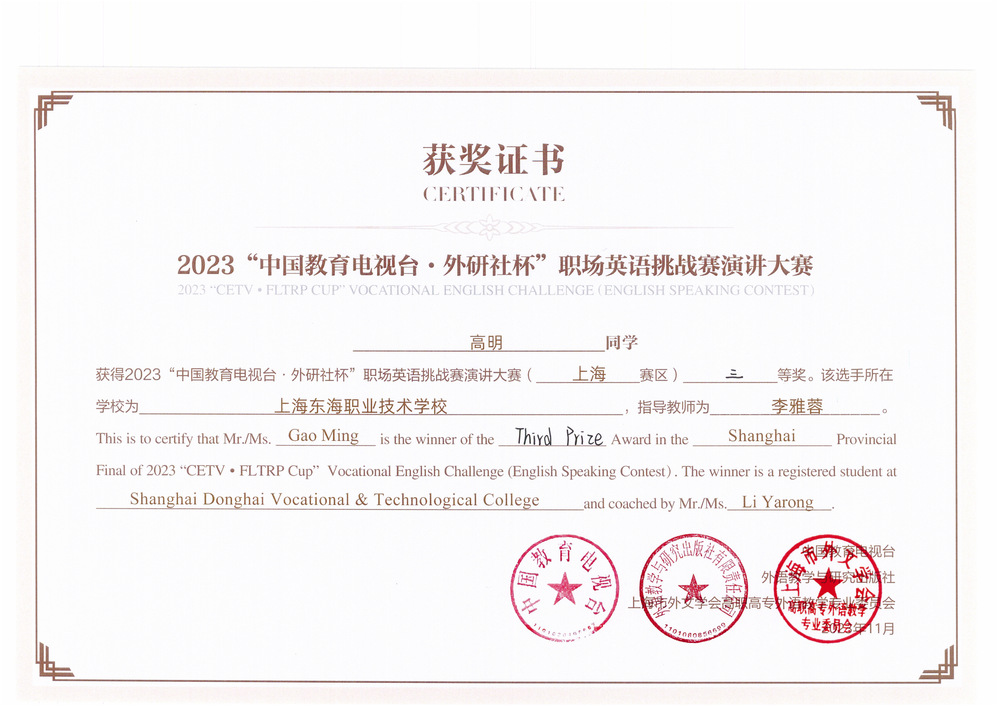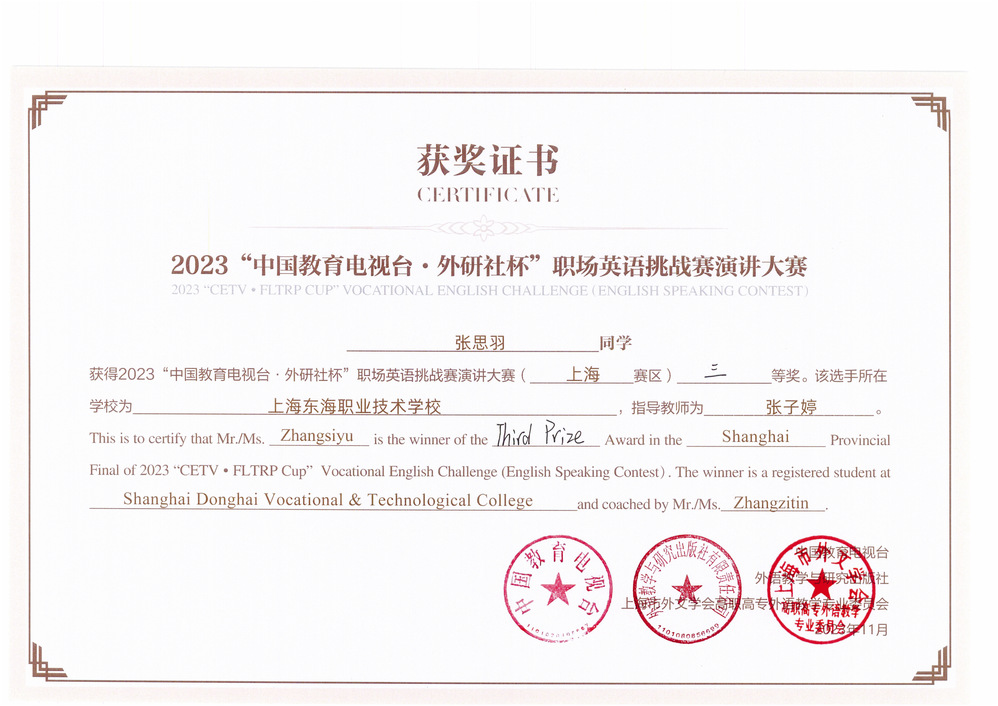 11月11日,2023“中国教育电视台 外研社杯”职场英语挑战赛演讲大赛上海赛区复赛传来捷报,我校关务222班张思羽、护理2311班沈沁语、会计236班高明三名选手均获得三等奖。此次比赛由上海电子信息技术学院承办,共有来自上海17所高职院校(包括公办院校和私立院校)的51名学生参赛。