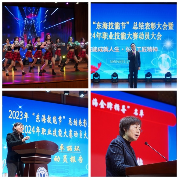 首先,副校长卓丽环作2023年“东海技能节”总结报告,并对2024年参赛进行总动员。她说,“东海技能节”于2016年正式创立,赛项以学院(部)为单位自主设计,设计原则一是以高级别、高规格大赛赛项内容为引领;二是根据学情适当调整评判标准。这样的设计原则既能保证绝大部分学生能够参与比赛,亲身感受“技能成就人生,弘扬工匠精神”的职业教育氛围,又可以提高赛项的水准,为市赛、国赛选拔优秀选手。举办8年来,“东海技能节”已然成为东海学院“弘扬工匠精神”的核心文化品牌和培育“大国工匠、能工巧匠和技术技能人才”的重要实践平台。2023年“东海技能节”于11月6日正式启动,东海学院全部7个二级学院和基础教学部共设25个竞赛项目,参加竞赛学生数达2838名,其中378位同学获得不同等级的奖项,获奖率比2022年提高4个百分点。