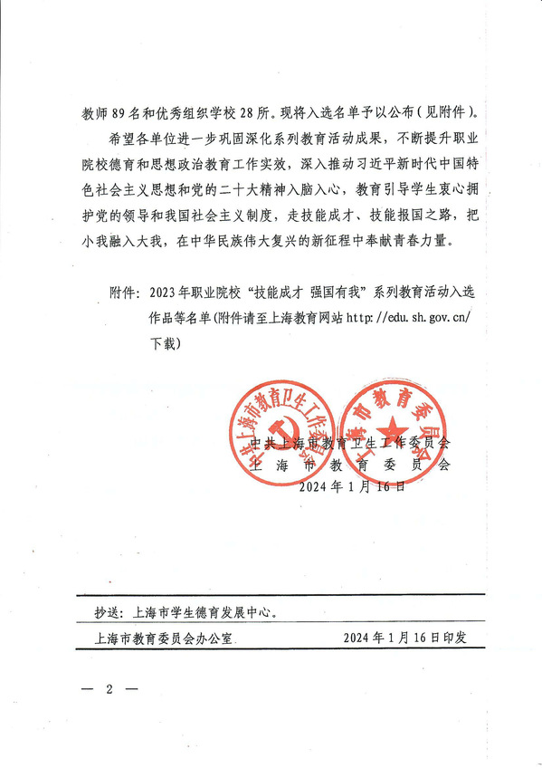为深入学习贯彻党的二十大精神,落实立德树人根本任务,根据《中共上海市教育卫生工作委员会上海市教育委员会关于开展2023年职业院校“技能成才强国有我”系列教育活动的通知》(沪教委德〔2023)14号)。作为此次活动承办方,学校领导高度重视,由学生工作部组织牵头,协同马克思主义学院、各二级学院师生参与。