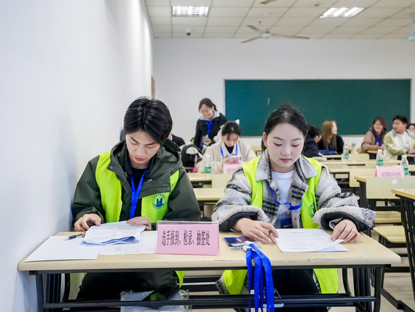 三个赛项均分两轮进行,持续时间长,赛项任务重。为了给选手提供更加细致贴心的服务,东海学院志愿者协会40余名学生志愿者在指导教师带领下于早上7时准时进场后,就开始了报到、签到、考场引导等服务。
