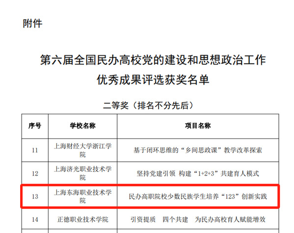 日前,由教育部思想政治工作司指导、中国民办教育协会党建专业委员会主办的“第六届全国民办高校党的建设和思想政治工作优秀成果评选”结果公布。我校学生工作部申报的《民办高职院校少数民族培养“123”创新实践》项目荣获二等奖。