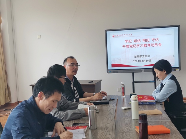 4月19日中午,基础部党支部在部门会议室召开了党纪学习教育动员部署会议。会议由支部支书记覃家宁主持。会上,覃家宁解读了校党委发布的《关于深入开展党纪学习教育的工作方案》。