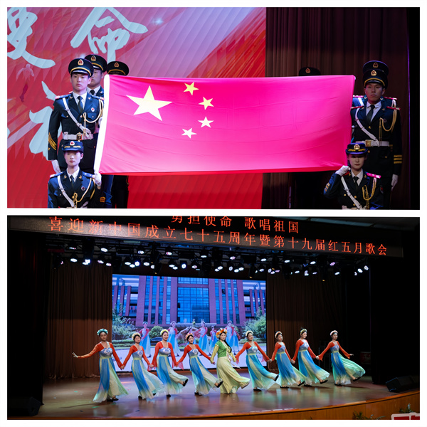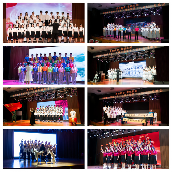 经管学院带来的经典红歌《歌唱祖国》,再现了1950年新中国成立一周年之际,天安门广场上五星红旗随风飘扬,鲜花如海的热闹景象;信息工程学院献上一曲气势雄浑的歌曲《红旗飘飘》,纪念1957年正式问世的经典读物《红旗飘飘》;艺术设计学院带来一首委婉悠扬的《如愿》,歌颂20世纪60年代节衣缩食,却突破了核弹、导弹和人造卫星等尖端技术,取得举世瞩目成就的我国人民;教育学院带来的音乐党课《绒花》,讲述社会发展迅速,国民的生活水平、文化水平、思想认知不断提升,人民自发运用各种文艺作品铭记峥嵘岁月,缅怀革命先烈的故事;护理学院带来的歌曲《相约1998》歌唱改革开放的第二十年,中国人民的生活水平已经发生了翻天覆地的变化;传媒学院围绕2008年这一历史性的时间节点带来金曲串烧《我和你》,回顾北京奥运会、汶川大地震、非典疫情等重要事件,歌颂党的正确领导;航空学院用一曲青春活泼的《少年》,歌唱波澜壮阔又影响深远的2009年至2019年;机电学院用一曲《新征程》,唱出站在历史交汇点,全面建设社会主义现代化国家新征程即将开启的中国气魄。