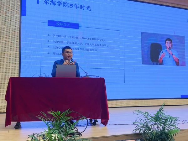 柯鹏越是国际商务专业13级的校友,他在东海学习期间曾荣获2015年上海市大学生创新创业大赛冠军、2016年第六届全国大学生创新、创意及创业挑战赛一等奖、2017年光明网全国十大创业青年。现任上海梵怀教育科技有限公司创始人及总经理。他以《我的人生,我做主》为题,分享了在东海学习和毕业创业的心得与经验。分享环节柯鹏越首先回顾了在母校度过的美好时光,表达了对母校的感激之情。他提到,“自尊自强认真求真”校训深深地影响着他,正是母校的教育和栽培和母校对他最初创业的支持,为他毕业后开创公司的成功奠定了坚实的基础;其次他以自己亲身的经历鼓励在校的学生一定要珍惜时光,努力学习专业知识,考取技能证书,同时注重培养自己的综合素质;再次他勉励同学们脚踏实地,积极利用学校附近大学的资源,关注各校公众号,学习自己感兴趣的优秀课程,制定阅读计划,要敢于尝试,突破舒服区,也要学会与他人合作,共同进步;最后他寄语在座的同学们要在未来的学习和工作中取得优异的成绩,为社会做出更大的贡献。