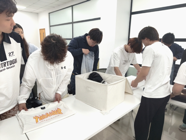 在实践环节,国旗班退伍学生王昊为大家现场示范收纳技巧和三秒叠衣法,并向大家展示如何在日常生活中快速地整理好衣物。随后,同学们趁热打铁,分成三组动手实践,整个过程乐趣横生,经过几轮实操练习,各小组成员的学习成果效果明显:不同种类、不同颜色的衣物整齐地叠放,整齐美观,节省空间。最后,三组同学展开了叠衣比赛,各组同学们认真仔细,短时间内熟练而又规整地叠好了自己面前的衣物,航空学院的同学们最终以“用时最少叠得最好”获第一名。