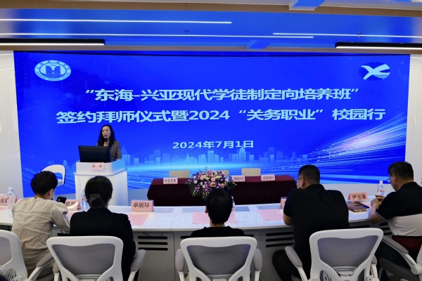 为贴近企业需求,培养适应关务行业数智化变革趋势的“四通一达”关务管理人才,7月1日下午,上海东海职业技术学院举行了“东海—兴亚现代学徒制定向培养班”签约拜师仪式,全国关务职业教育教学指导委员会副秘书长朱昱铭、上海市报关协会秘书长尚思瑶莅临指导,我校校长贺瑛、副校长卓丽环、副校长严玉康、校长助理张居阳、上海兴亚报关有限公司副总经理金晨宇、唐昶鸿和关务咨询总监王佳乐、经管学院国际物流系全体专业教师、兴亚报关公司企业师傅及定向班全体学徒出席活动,签约拜师仪式由经管学院副院长吕薇主持。