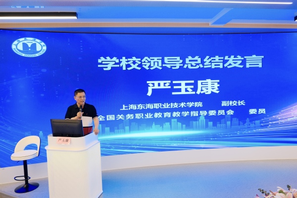 副校长严玉康在总结发言中向来宾介绍了学校现代学徒制项目建设的深厚底蕴。他指出,东海经管学院早在2017年就与欣海报关公司合作,形成了丰富的校企人才培养和课程共建经验,2018年顺利通过教育部现代学徒制项目验收,输送了一批优质关务人才,获得企业及社会好评。经过多年不断发展,关务专业办学实力位居上海市第一,专业定位特色鲜明,此次又与兴亚报关公司合作开设现代学徒制定向班,进一步深化产教融合,现代学徒制培养和AEO标准导入教学相融合,在现代学徒制联合培养方面再上新台阶,在技能实践、课程共建,师资及教学资源建设等方面进一步切合行业数智化发展趋势。