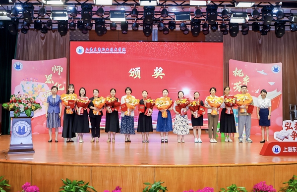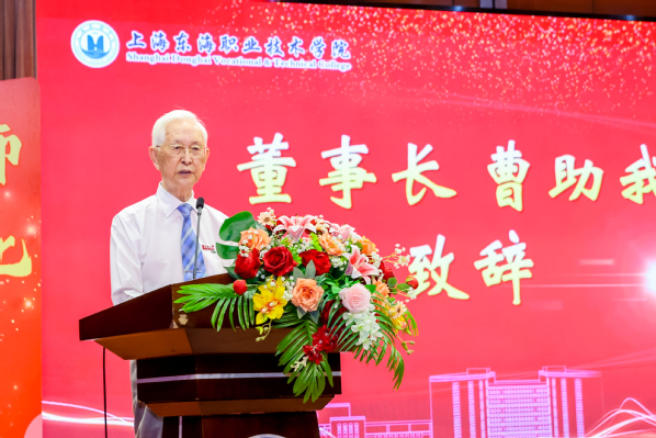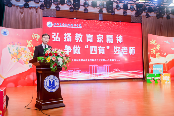 董事长曹助我在大会上致辞。他代表董事会向躬耕于东海教育事业发展的老师们致以节日的祝贺。当下,聚焦国家和上海的发展需求,东海学院正在逐步调整和优化专业方向,为了更好地应对这个变化,曹助我就“如何做一名优秀的高职教师”,提出了五点希望和要求:一是加强对国家教育方针政策的深入学习与理解,及时掌握最新的教育动态和政策要求。二是夯实专业理论知识,确保教学内容与行业发展同步,促进教师之间的知识共享和经验交流。三是制定企业实践计划,保障教师企业实践与技能提升,提高教学的实用性和针对性。四是发挥校园文化的育人作用,通过引导学生参与各类文化活动,增强其社会责任感和实践能力,提升综合素质。五是进一步发挥党团员的先锋模范和堡垒作用。建立和完善党团员发挥作用的长效机制,在专业调整改革中,进一步将党团工作与学校各项工作紧密结合,确保党团工作与学校发展同步推进。结合学校实际,创新党团活动内容和形式,提高党团活动的吸引力和实效性,使党团活动更加贴近学生、教师和学校的发展需求。他希望全体教师弘扬教育家精神,争做“四有”好老师,以成为一名优秀的高职教师为己任,不断探索高等职业教育发展之路,为我国教育事业发展贡献自己的力量,谱写新的篇章。