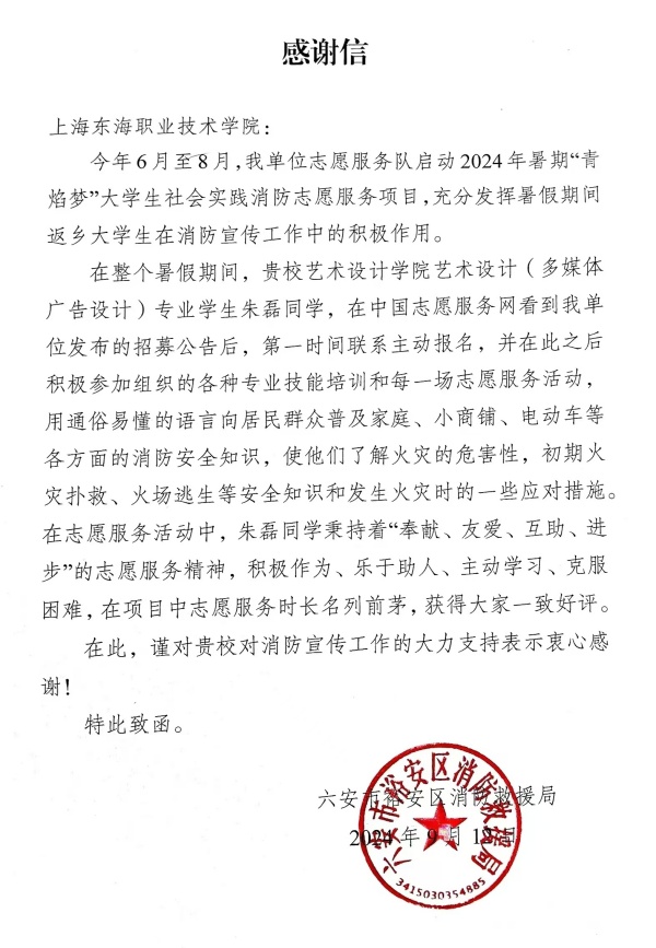 在全面贯彻落实国家关于加强校园消防安全教育的重要精神下,上海东海职业技术学院凭借其扎实的日常消防教育、培训工作,将消防安全意识深深植根于每一位师生心中。近期,我校艺术设计学院学生朱磊在暑期参与的“大学生社会实践消防志愿服务项目”中表现突出,获得了安徽省六安市裕安区消防救援局的高度认可与赞扬,并专门发来感谢信,为东海学院的消防教育工作再添一抹亮色。