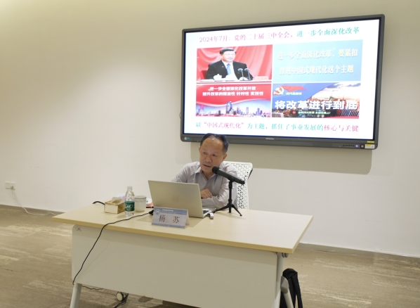 杨苏以“学习****届三中全会《决定》的思考——坚定以‘中国式现代化’全面推进中华******”为题作辅导报告。辅导报告从****届三中全会的重要背景、深刻认识****届三中全会的重大意义、深入学习领会*****记在全会上的重要讲话精神、****届三中全会《决定》最新战略部署及新理念新举措等方面,作全面系统的阐释和宣讲。强调指出,****届三中全会是在以中国式现代化全面推进强国建设、民族复兴伟业的关键时期召开的一次十分重要的会议。*****记的重要讲话,全会审议通过的《中共中央关于进一步全面深化改革、推进中国式现代化的决定》,是在新的历史起点上推进全面深化改革向广度和深度进军的又一次总动员、总部署,充分体现了以*********党中央以进一步全面深化改革开辟中国式现代化广阔前景的坚强决心。
