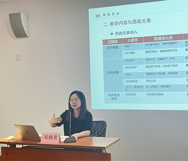 讲座第二部分,郑梅青副教授以“《小企业财务会计》”为例,就课程思政设计进行了分享。她结合自身教学经验,从“课程概况与思政目标”“教学内容与思政元素”“教学方法与思政融入”“教学过程与思政案例”“课程评价与思政效果”五个方面,详细展示了课程思政的具体实施情况及其成效,深入分析了该课程思政的特色与创新点。