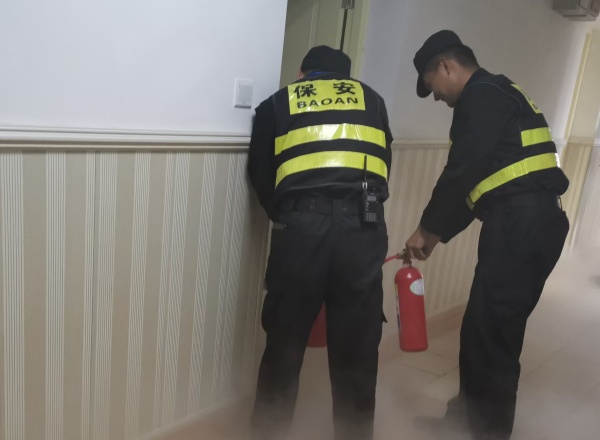随着演练指令的下达,模拟火灾现场瞬间烟雾弥漫。两名保安巡逻人员迅速拿起灭火器,对初起火灾进行了有效的扑救,为后续的疏散工作赢得了宝贵的时间。与此同时,微型消防站的队员也迅速响应,他们熟练地连接水带,对火势进行了进一步的控制和扑救,以最快的速度对火源进行了有效控制,充分展现出了我校高效的应急处置能力。