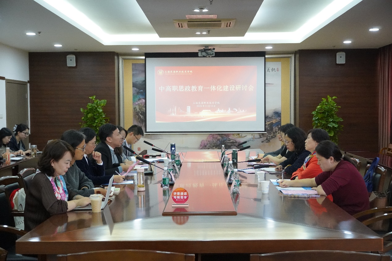 为深入学习贯彻习近平总书记重要讲话精神,落实立德树人根本任务,进一步推进思政课建设内涵式发展,促进中高职思政教育资源的有效整合与共享,加强教师队伍的交流与合作,我校教务处、马克思主义学院与各贯通专业中职校于11月15日下午在东海源南815会议室联合举办了专题研讨会。本次研讨以“中高职思政教育一体化融合与创新”为主题。校长助理、教务处处长张居阳、教务处副处长杨威、马克思主义学院院长龙燕、与我校有贯通合作专业的上海市奉贤中等专业学校、上海第二工业大学附属浦东振华外经职业技术学校、上海商业会计学校、上海市第二轻工业学校、上海市经济管理学校等五所中职校的校领导或思政教研室负责人,以及全体马院教师参会。研讨会由马克思主义学院院长助理施晓玮主持。