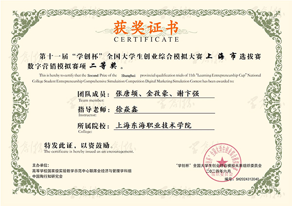 9月21日,第十一届“学创杯”全国大学生创业综合模拟大赛上海市预选赛在线上举行。信息工程学院徐焱鑫老师指导的由计算机应用技术专业中高职贯通(大数据方向)班的奚时律、夏凌峰、朱佳昱组成的队伍,经过激烈角逐,荣获数字营销赛项一等奖。此外,徐焱鑫老师指导的由曹欣满、徐嘉瞳、许波组成的队伍,以及张唐颉、金孜豪、谢卞强组成的队伍,分别荣获数字营销赛项二等奖。由刘艳、杨海俊老师指导的魏艳军、胡辰星组成的队伍,荣获综合创业赛项二等奖。