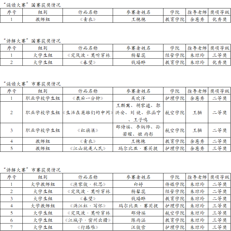 近日,中华经典诵写讲大赛组委会公布了第六届中华经典诵写讲大赛获奖名单。代表我校参加市赛的12件师生作品中,共获得市赛7个二等奖和5个三等奖,创我校100%得奖率。其中有8件作品被选送国赛,有3件作品在“诵读中国”经典诵读大赛和“诗教中国”诗词讲解大赛中获1个三等奖和2个优秀奖,取得东海学院历史最佳成绩。