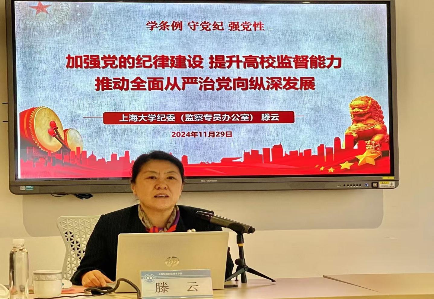 滕云同志以《加强党的纪律建设,提升高校监督能力,推动全面从严治党向纵深发展》为题,从党的纪检监察历史经验到当下实践,从理论探索到案例剖析,聚焦高校人员任免、考试招生、物资采购、资产管理、基建项目、评审评比、因公出国七大重点领域,立足党纪学习教育、“六大纪律”及案例警示、聚焦重点领域监督、履职尽责知行合一四个方面,深刻而又生动地详细阐述了纪检监察工作对民办高校规范发展保驾护航的重要性和现实性。滕云同志还将上海大学纪检监察工作的探索历程娓娓道来,分享了“13579”上大纪检监察工作实践探索的宝贵经验,为我校纪检监察工作开展提供了有益的启示。