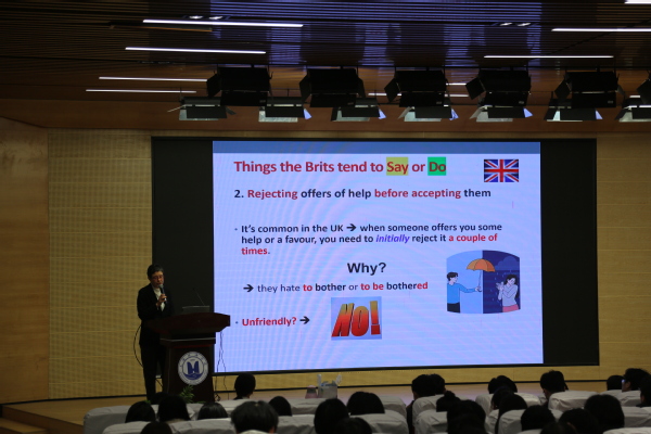 讲座开始前,匠兴苑报告厅已座无虚席,学生们对跨文化沟通表现出浓厚兴趣。牛晓伟首先用英语致辞,热烈欢迎Yuliya Skaleva外教的到来,并简要介绍了她的教育背景和研究领域。接着,Yuliya从英国文化与语言的关系出发,深入分析了英国沟通风格的礼貌性和间接表达方式,帮助学生更好地理解英国文化。