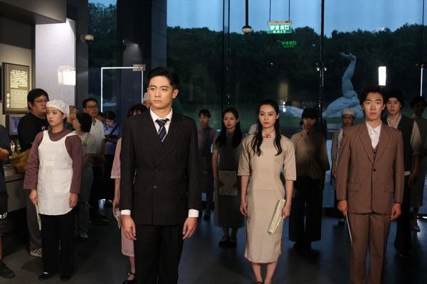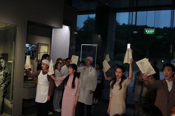 该故事聚焦在中华民族的危难时刻,有一群战士以纸张为战场,以笔墨为烽火,照亮黑暗,唤醒民心。《纸上烽火》以龙华烈士纪念馆展陈人物邹韬奋为原型,讲述他为抗战奔走、不畏强权的英勇事迹。再现邹韬奋、杜重远等知识分子群像,他们以“天下兴亡、匹夫有责”的担当,将个人命运与民族存亡紧密相连。在场的同学们驻足观看,沉浸式感受那段烽火连天的岁月。