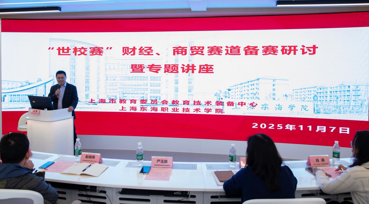 为了深入贯彻国家关于推动职业教育高质量发展的决策部署,培养高端技术技能人才,帮助各高职院校深入把握世界职业院校技能大赛和上海市“星光计划”财经与商贸类赛事的最新趋势和竞赛规则,全面提升各校在大赛中的备赛能力与竞赛成绩。11月7日,受上海市教委教育技术装备中心委托,由上海东海职业技术学院主办的“世校赛财经、商贸赛道备赛能力提升培训研讨会”举行。上海市教委教育技术装备中心副主任赵晓伟、职业教育科科长潘波和19所兄弟院校财经商贸赛道的专业负责人及赛事指导教师共46人出席会议。本次会议特邀全国职业院校会计技能大赛专家组组长高翠莲、上海市“星光计划”《业财税融合大数据应用》赛项裁判长肖谦等专家进行专题讲座和现场指导。
