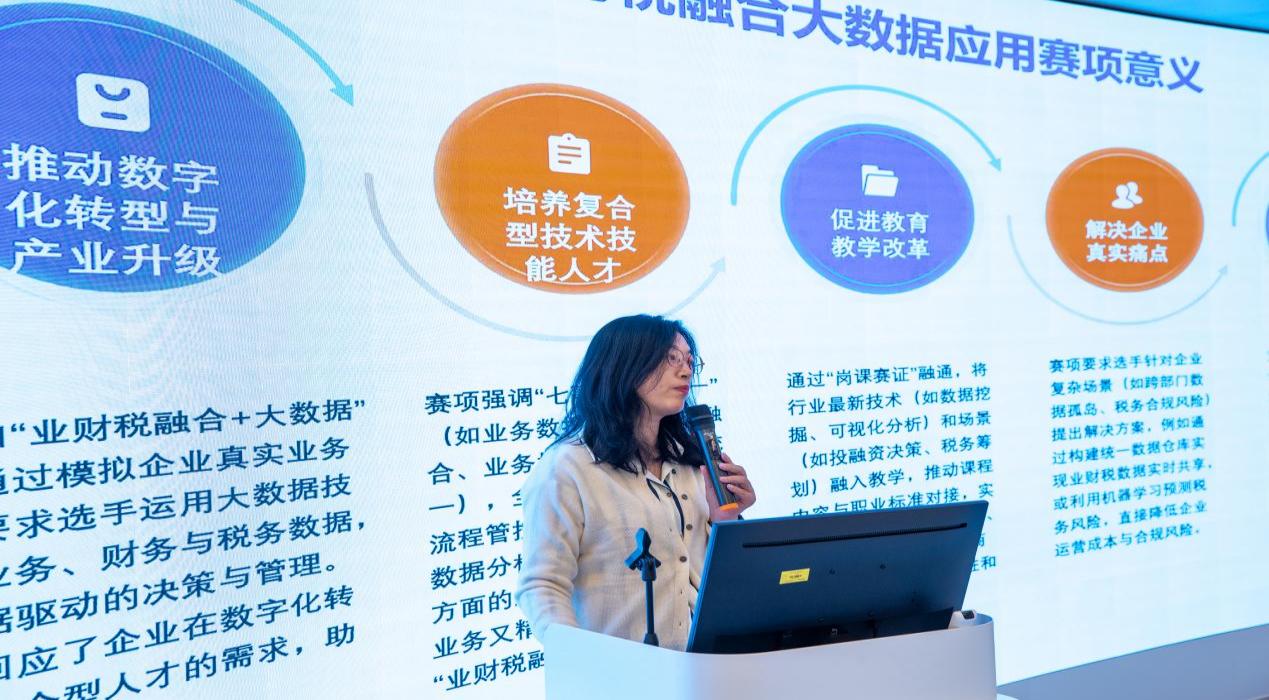 肖谦以《赛事规则与执裁要点解读》为主题,结合多年执裁经验,对评分标准、操作规范、常见扣分点等关键规则作了深入剖析,提醒指导教师要注重学生专业素养与细节把握能力的双重提升。她基于本年度“星光计划”《业财税融合大数据应用》赛项的执裁工作,对参赛院校提出了若干建议。