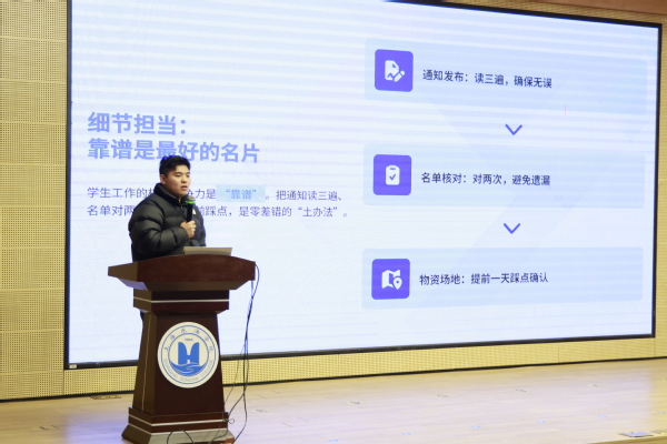 曾任学院学生会主席的宋金来同学,从学生会主席的责任与担当、如何平衡学业与学生工作、提升个人核心能力等方面进行分享。建议学弟学妹们做好时间管理,掌握沟通艺术,积极参与实践创新活动。