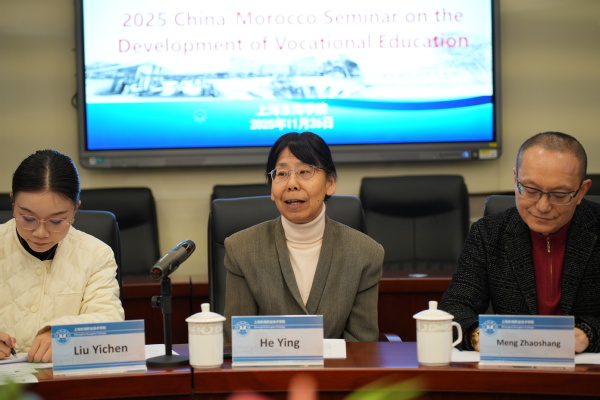 研讨会上,校长贺瑛首先致辞对摩洛哥代表团的到访表示诚挚欢迎,并结合东海学院宣传视频介绍学校办学成就以及上海民办职业教育概况。东海学院作为1993年创办的中国早期民办高等职业院校,33年来坚守职教初心,凭借历任领导的深厚积淀与内涵式发展理念,稳居软科中国职业院校全国第三、上海第一。贺瑛提及“东海1号”“东海2号”无人机等科创成果,回顾双方在海外“中文+职业技能”基地建设、专业标准认证、师资交流等方面的扎实合作基础,强调双方办学使命契合,期待深化多维度协作,共促中摩职教发展,并祝愿嘉宾此行顺遂。