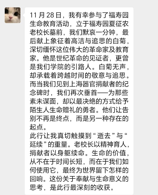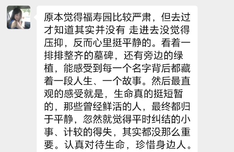 在福寿园相关负责人的生动讲述中,以东海老校长夏征农等为代表的先贤事迹,深深触动了在场的同学们。大家在肃穆的氛围中深切感悟到生命的奉献、传承与超越,完成了一次深刻的精神洗礼。