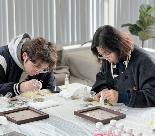 最后,在专业老师的指导下,党员们参与了“非遗匠心·中草药创意画”手工制作活动。大家从认识草药、了解其特性入手,亲手摆弄各类中草药素材,发挥创意进行构图粘贴,在“就地取材、因材施艺”的非遗智慧中,完成了一幅幅独具韵味、可长久保存的天然艺术品。此次实践,不仅让大家领略了中医药文化的自然美感与哲学内涵,更将“工匠精神”内化于心,增强了文化自信与使命担当。