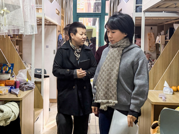 午餐交流后,王玉一行前往六号楼学生宿舍走访查看。她实地检查居住环境,细致叮嘱同学们要增强安全意识,保持宿舍卫生,共同筑牢安全卫生防线,营造整洁有序的生活空间。