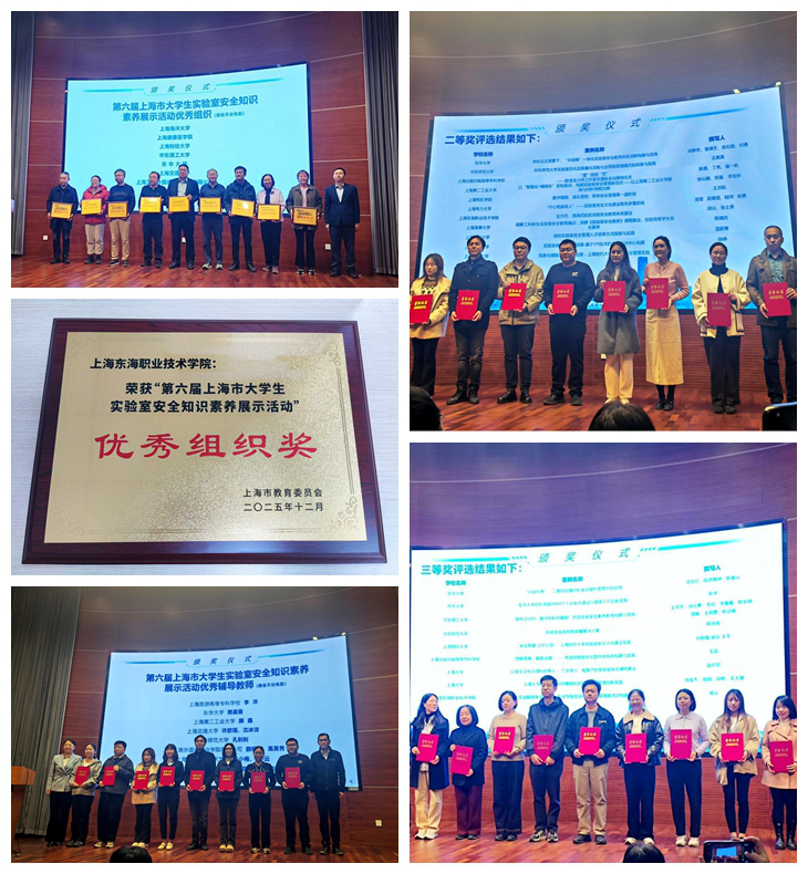 本次活动作为第四届上海高校“实验室安全月”的重要组成部分,共评选出一等奖9项,二等奖11项,三等奖17项,我校是获奖高校中唯一一所民办职业院校。同期颁发了第六届上海市大学生实验室安全知识素养展示活动奖项,我校荣获“优秀组织奖”,许小梅、邱云老师获“优秀辅导教师奖”。