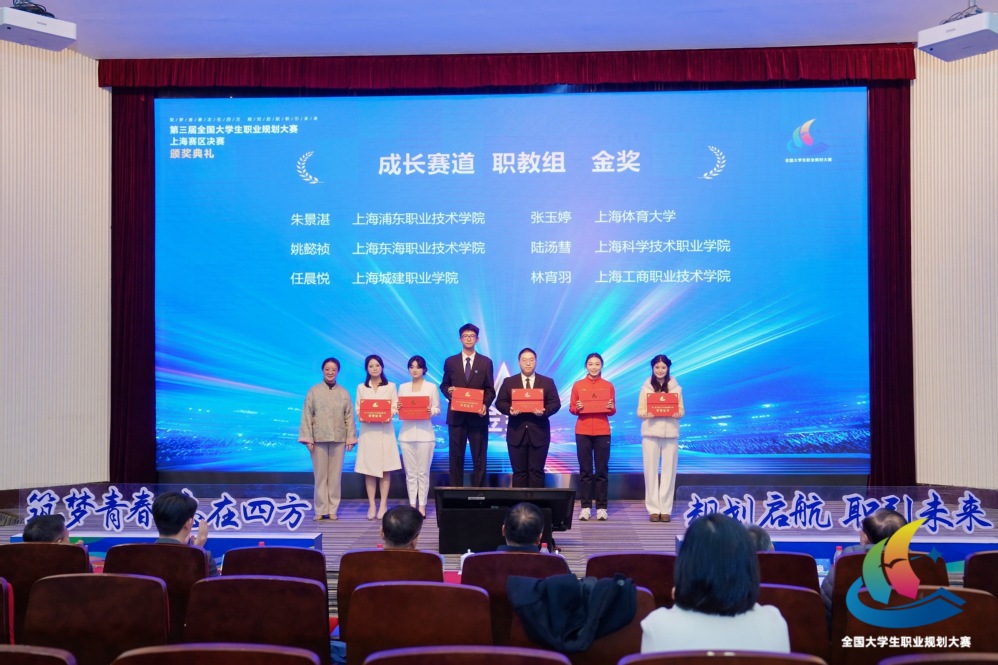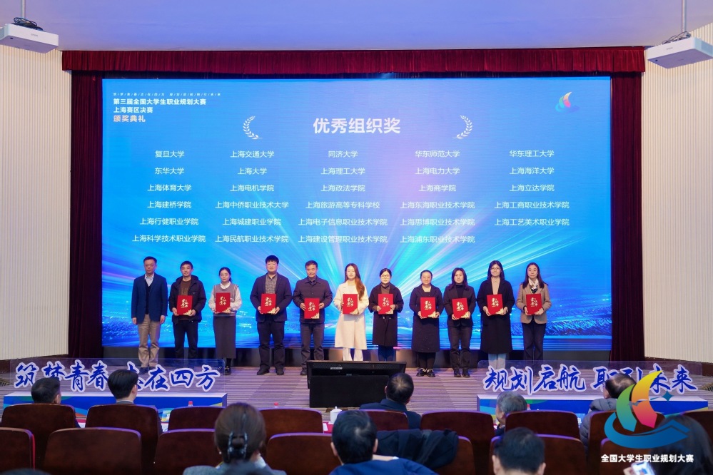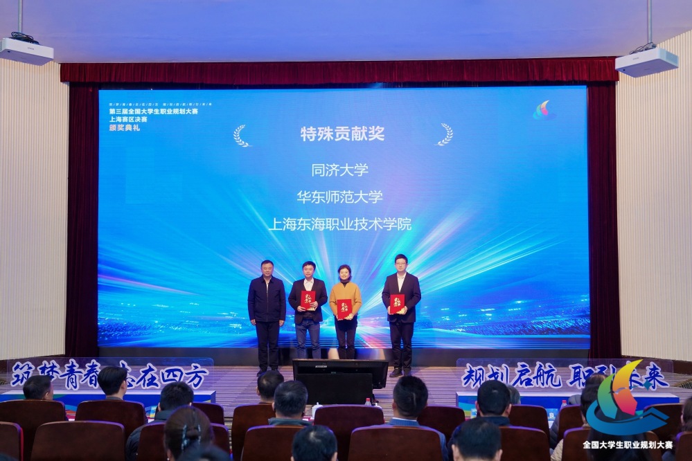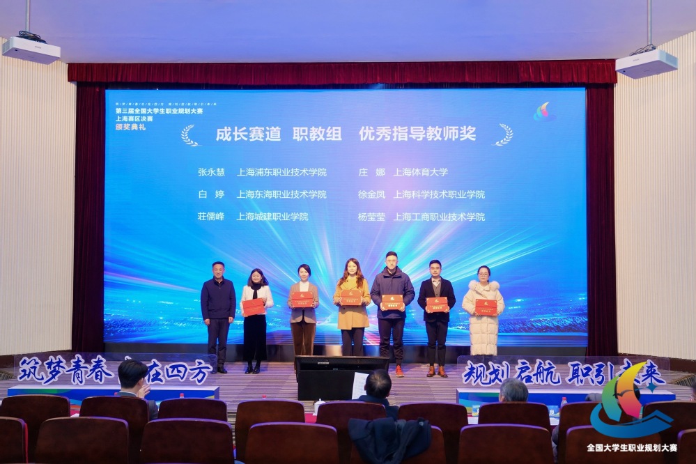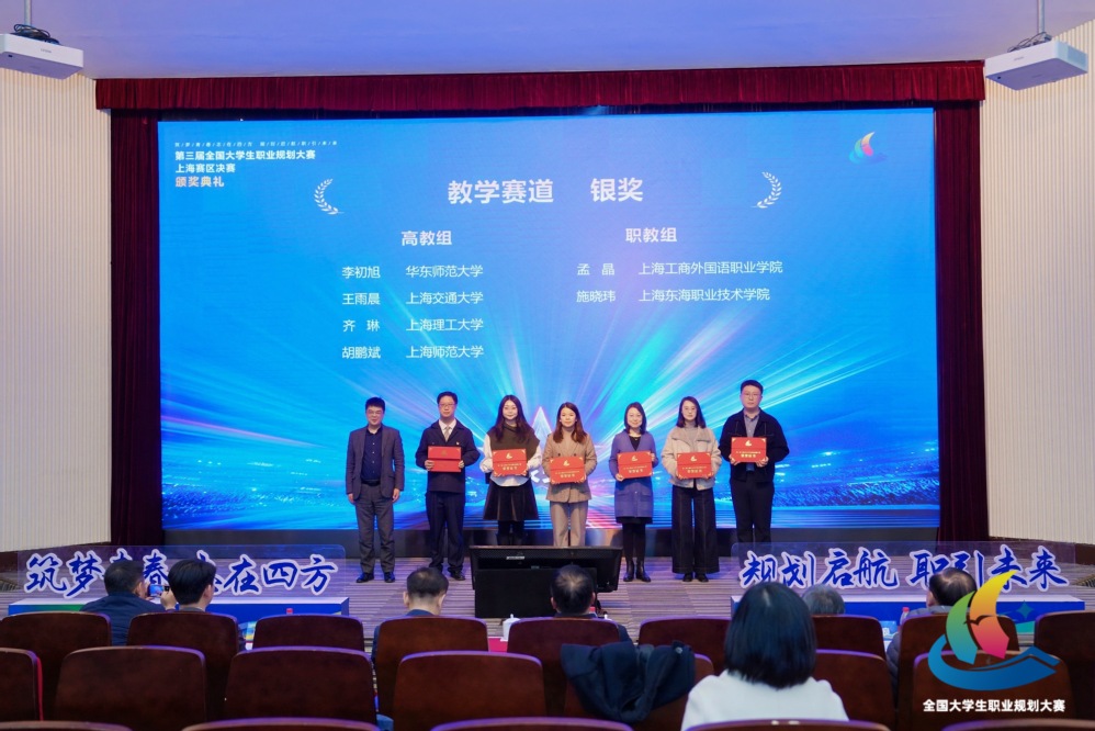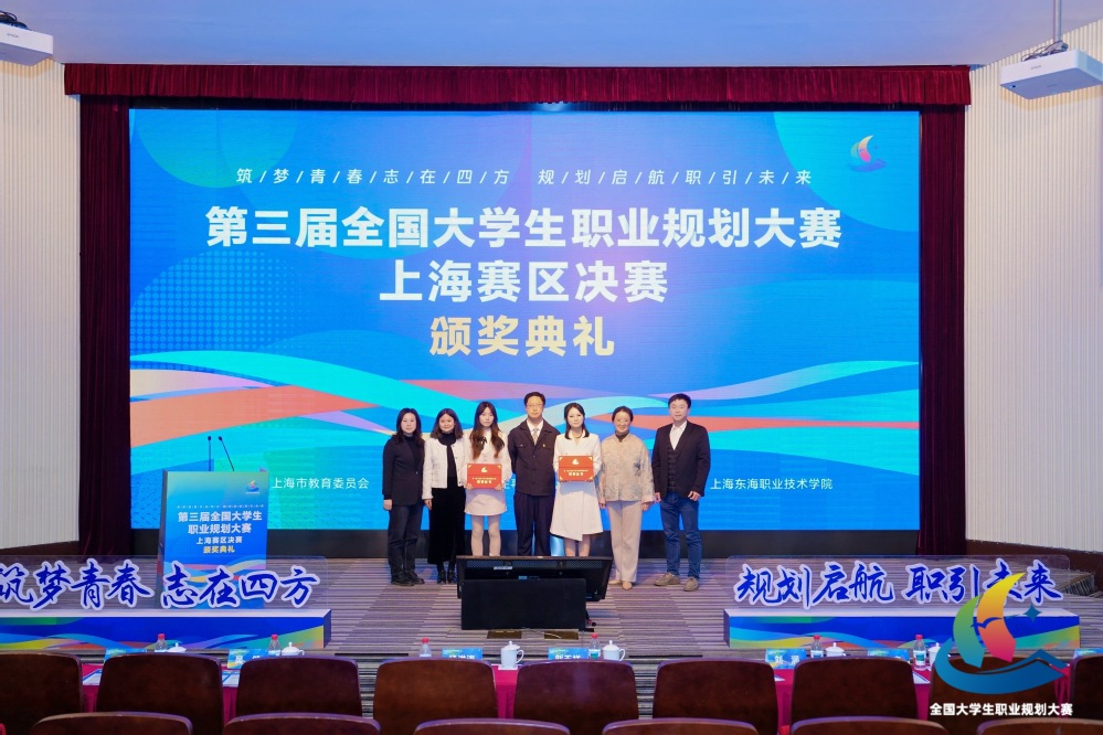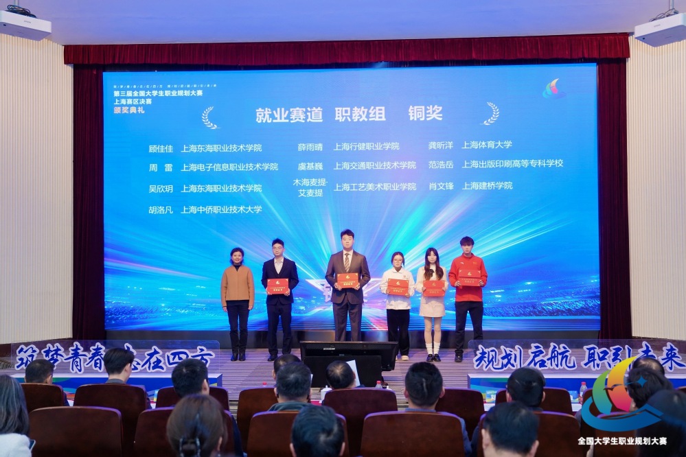 12月28日,第三届全国大学生职业规划大赛上海赛区决赛举行,经过风采展示、现场答辩等环节,上海东海职业技术学院师生代表一举斩获1个金奖(成长赛道)、1个银奖(教学赛道)、2个铜奖(就业赛道),在同类型高校中奖牌数位列第一(其中传媒学院姚懿祯同学获金奖,马克思主义学院教师施晓玮获银奖,艺术设计学院顾佳佳、经管学院吴欣玥两位同学各获铜奖)。同时,学校荣获大赛“特殊贡献奖”与“优秀组织奖”,传媒学院教师白婷获评“优秀指导教师”荣誉称号,展现了学校在职业生涯教育与就业指导方面的扎实成效。