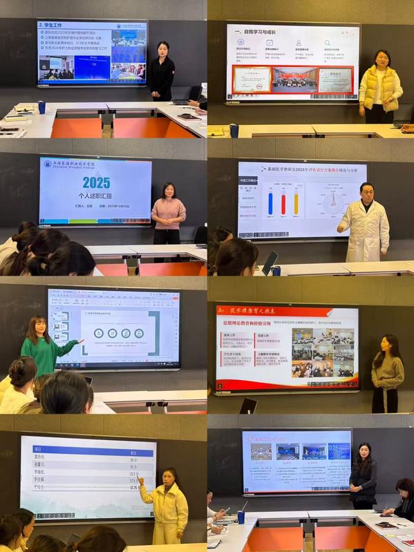 随后,大会进入总结汇报环节。任课教师、实训员、辅导员及行政人员依次登台,结合各自岗位职责,全面梳理了2025年度在教学科研、实训建设、学生思想政治教育、日常管理服务等工作中的成果与亮点,深入剖析了工作中存在的问题与不足,并提出了针对性的改进思路与下一步工作计划。汇报内容详实具体、重点突出,充分展现了全院教职工履职尽责、积极进取的良好风貌。
