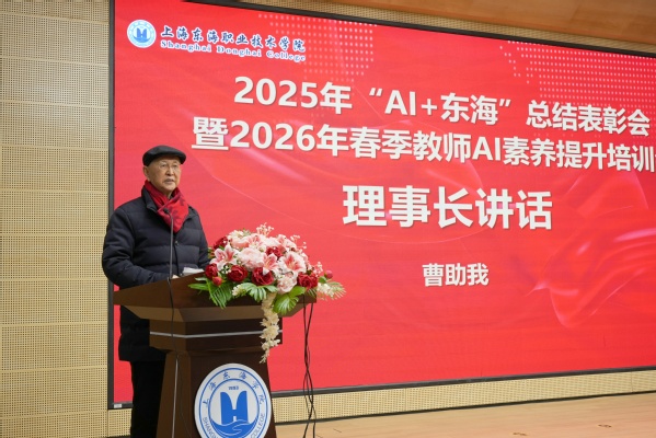 理事长曹助我在会上致辞。他充分肯定东海学院2025年“AI+教育教学”工作,并对所有投身AI教学实践的老师们表示感谢。展望2026年,曹助我对所有东海人提出四点期望:一是推动实训教学从“实体依赖”向“虚实融合”转型;二是推动教学组织从“标准化”向“个性化”跃升;三是推动人才培养从“学科导向”向“岗位导向”衔接;四是推动教育管理从“人工低效”向“智能高效”升级。希望东海人以智慧教育赋能未来,以创新实践激活课堂,携手谱写东海学院“AI+教育”高质量发展的崭新篇章。