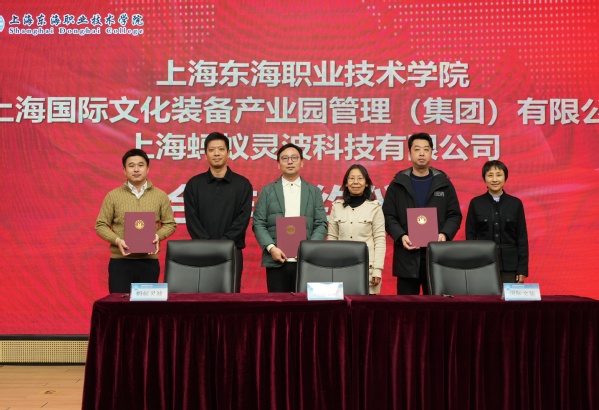 在“AI+教育教学”校企战略合作签约仪式上,上海国际文化装备产业园管理(集团)有限公司、上海蚂蚁灵波科技有限公司、上海东海职业技术学院三方签订了校企合作框架协议。三方就共同推进在数智文旅装备、具身智能、人形机器人等领域的产教融合协同创新达成共识。