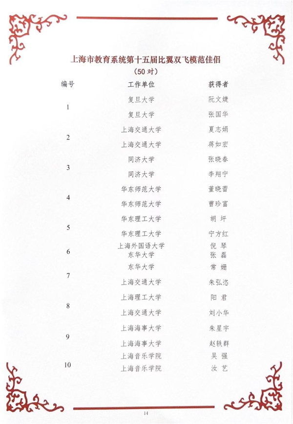 为深入贯彻习近平总书记关于注重家庭家教家风建设的重要论述,全面贯彻落实党的二十大和二十届历次全会关于传承弘扬中华民族家庭美德的精神,响应中国妇女十三大号召,进一步推动家庭文明新风尚建设,上海市教育工会、市教育系统妇工委组织开展了上海市教育系统第十五届比翼双飞模范佳侣、第四届最美家庭评选活动,经评审公示后于“三八”国际妇女节大会中予以表彰。